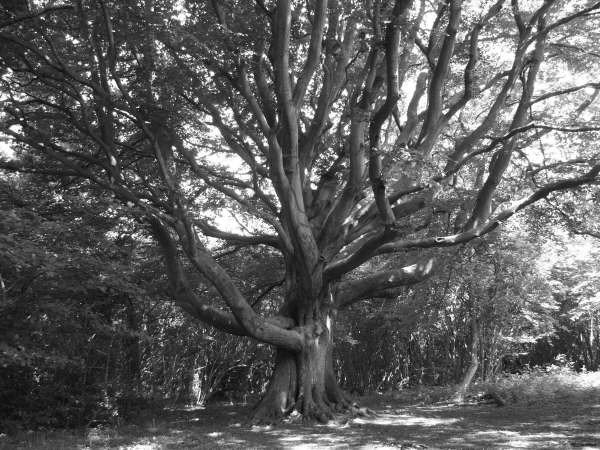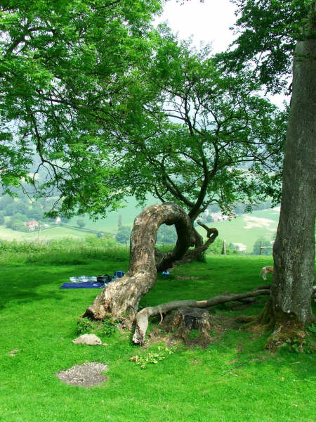 A couple of beers at the Frankland Arms (the only pub in the village) was most welcome on a hot afternoon. Arundel Stronghold is recommended as the local fare. In fact it was so pleasant that we booked a table for a meal that evening. Before returning to camp we decided to continue our church visits in search of a certain goal – again more later. This time it was Patching. After a visit to this church we returned to camp and spruced ourselves up. We walked to the Frankland on this occasion so we could all have a drink. Well the food was mediocre, the waiters were great but boy does the manageress lack people skills! We weren't exactly made to feel welcome so its a bit of a thumbs down really. Back to camp and general silliness (unusually) took over. A quieter night was had than the one before but then we think our silliness scared off all the children. Oh well! Day 3 dawned bright again and this time we were off to another location (after a Little Chef brekkie) which has featured high in our list of places to see for some time, although Paddy has been before so we came equipped with our own guide. Another centre of alleged UFO activity and also ritualistic occult practices and a centre for paranormal investigations for some years, Clapham Woods has an odd air about it. It is secluded off the main road through the Findon Valley which is a scenic beauty in itself. The woods scale the southern escarpment of the hills here. Fullornly we searched the woods and found odd hides fashioned among the trees and also the remnants of solvent abuse at various key locations. The main part of the woods (even though we had no idea of its significance) held a strong energy that could be felt as we entered, although reaching one of the oldest beach trees we have seen showed that carvings of odd shapes still exist in its bark. A tree mutilated by fantasists. It made for some spectacular photographic opportunities and we were glad to have made the excursion. |