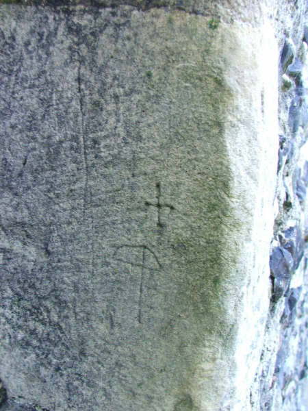 Now to reveal the church quest as we visited our third and last just prior to Clapham Woods. Rumour has it that one of the three churches in the Findon, Patching and Clapham benefice has a carving on a door jam. This is not rare but this one is alleged to be of an alien! It is also somewhat akin to the Long Man of Wilmington, a chalk hill figure about 30 miles to the east. Findon church was locked but exhibited Victorian restorations in the visible door jams with no marks. Patching and Clapham were found to be similar so the mystery remains. All the churches have their own distinctive air and are well worth a visit but were all heavily 'restored' by the Victorians. It is not unusual to find carvings on door jams ranging from pilgrims crosses in Kent particularly and also marks left by the stone masons as a signature. Dave believes that what might be causing this mystery is one of these masons marks and an example of a simplified human figure is shown below from a Kent church to highlight the point. We also met the resident church cat at Clapham and a proud beast he is!