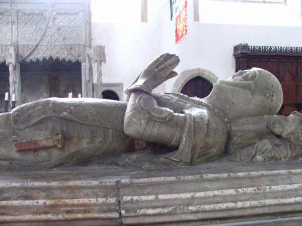 Also buried here is John the 7th Earl who continued the fight in the Hundred Years War and was known as 'The English Achilles'. Over 6 feet tall he was an imposing figure and an excellent soldier until he required an amputation of his leg at Beauvais in 1435. The amputation killed him and he lies, minus his leg, under an elaborate tomb. His armoured effigy lying above an image of his own corpse.