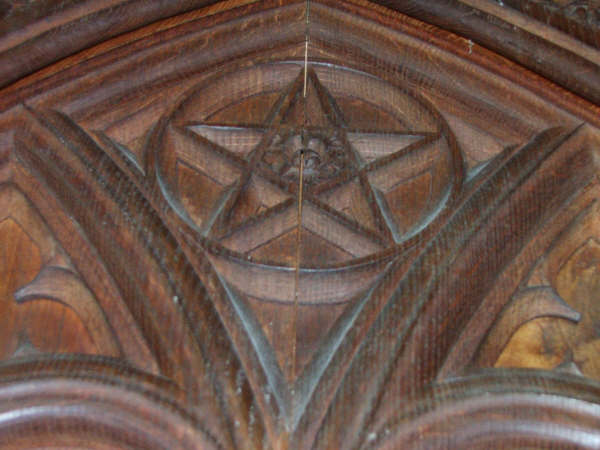 A side chapel was added by the ever resourceful Victorians to house the memorials of the 13th Duke and his wife. Somewhere and somehow the title changed from Earl to Duke. We are currently awaiting a reply from the castle on our second question. We found that the wood paneling around the 13th Dukes chapel contained pentagrams, an ancient symbol of protection and pagan beliefs. However when inverted this has a whole new meaning. There is a pentagram on every other panel and on one of these it is inverted.