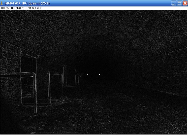 the photographer. The edge plots show that the reconstruction done with Ian's arm has solid edges and also a solid edge to its associated shadow. Compare with that on the right for the anomalous photograph which does not recognise any solid edges either to the red shape or its associated shadow. This is in response to the focal length settings in operation on the lens of the SLR camera at the time of shutter release and as such may not accurately represent the true edges. These results are produced purely by using the software available without manipulating the photograph or the resulting images. We cannot explain what they purport to show other than we find the results interesting. The noises noted upon the left flank or within the tunnel were never identified although the wind may have been a contributory factor in anything heard during this time. The reported sighting of shadows could not be explained. After sitting for some time in darkness itis possible that a persons eyes become weary and begin to transmit images to the brain which are either false or exaggerations of any natural phenomena. This may be the case in these reported instances. Their correlation with reported sensations and noises may, or may not, be purely coincidental. The feelings of nauseousness within the centre counterscarp may have many causes. It is known that Kim has a profound concern when in enclosed spaces. This is not often seen on investigations as we seldom find ourselves in such locations. It may be possible that, although she did not complain with any regularity during this time of such feelings, that her feelings may have subconsciously had some detrimental effect on the rest of the team. The odour within the counterscarp may have contributed to the sensations felt by Paddy and Dave and the general feelings of Ian. This type of psychological effect cannot be ignored in this instance. Paddy's initial thoughts of the electricity cable in the magazine being responsible for the sense of movement was found to be unfounded and cannot be explained. The sounds of movement, then heard, were initially identified by Dave as being from a pile of objects in the corner of the room which he interpreted by their outline to be plastic sacks of gravel or similar building materials. It was envisaged that the noise may have been from the wind rustling the wrappings or a rodent walking across them. This was found not to be the case when the objects were identified as solid rubber road speed ramp pieces. The sound itself remained unidentified. During our stay a certain amount of other information was forthcoming