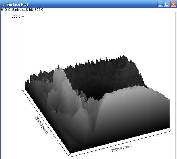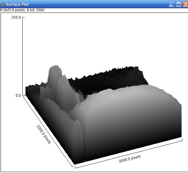 It can be seen that Ian's arm produces only one shadow immediately behind his arm. A similar shadow can be seen on the lower side of the red anomaly. The red anomaly, however, also produces a further faint shadow extending along the tunnel that Ian does not. Comparison of the picture using available software firstly to show surface plot (the 3D make up of the photograph), and secondly to plot all solid edges produced the following for each of the above respectively.
