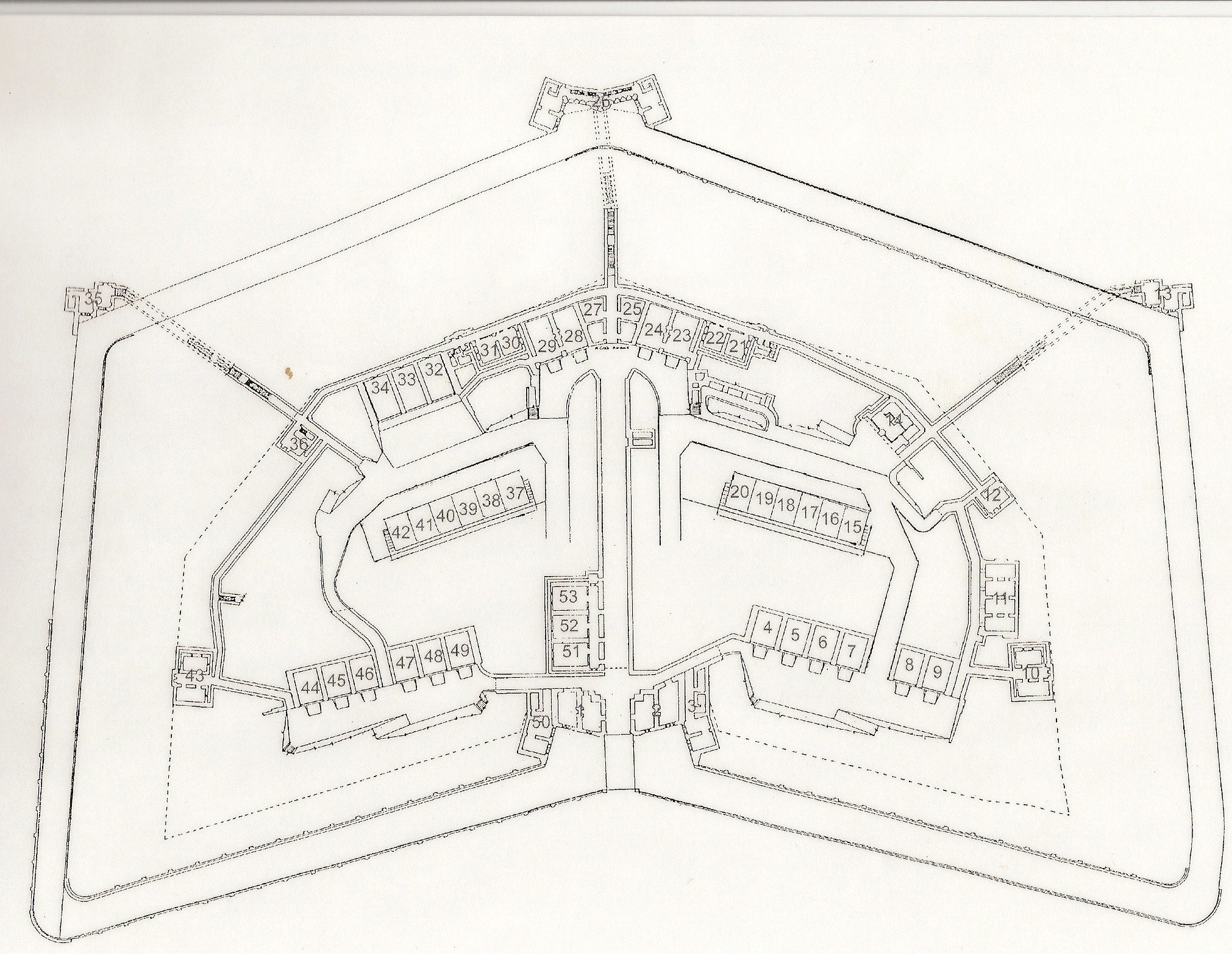 The entrance shown at bottom centre, centre counterscarp at top centre (26) and casemate (28).