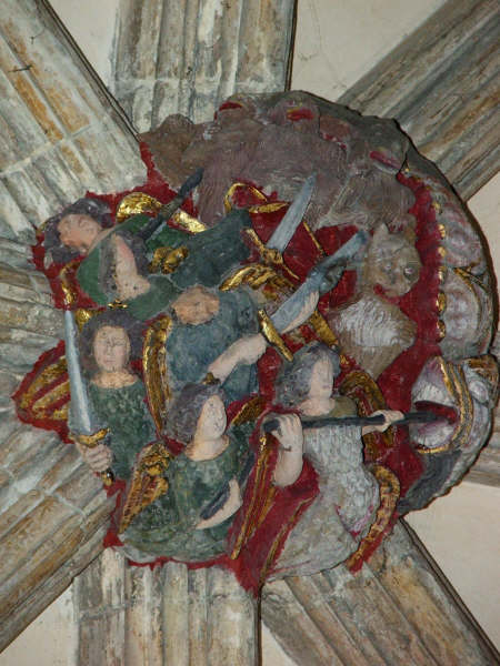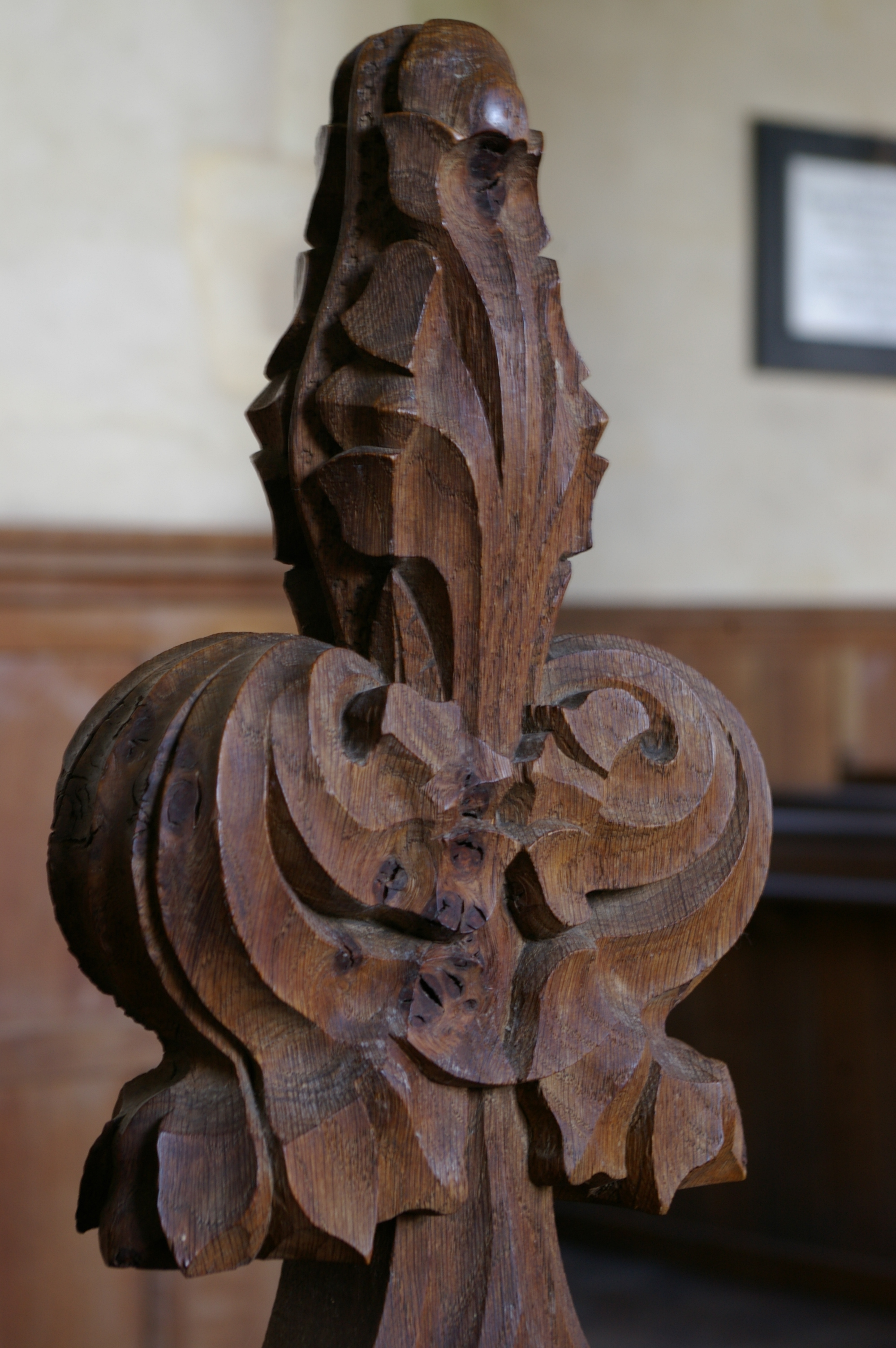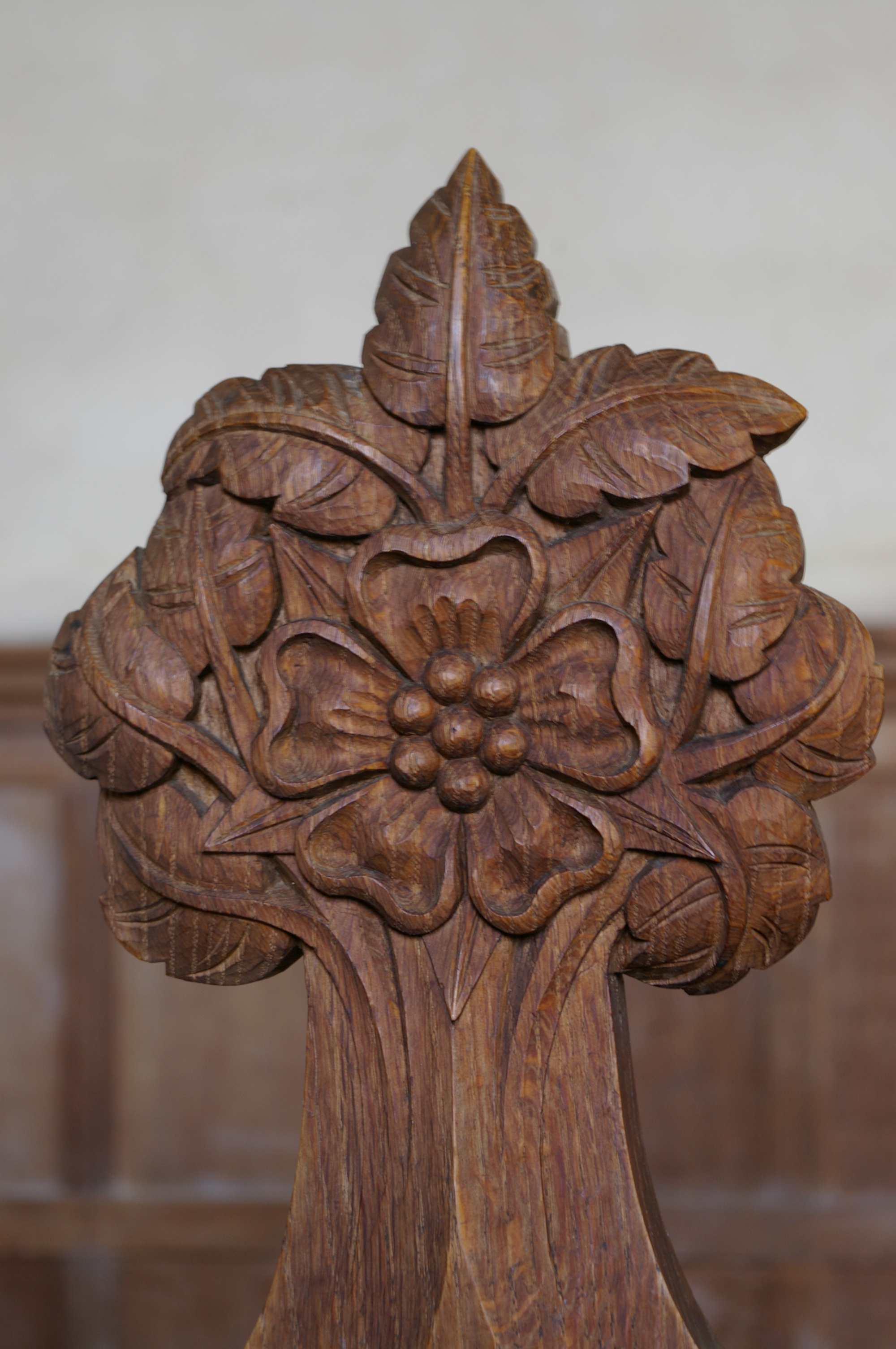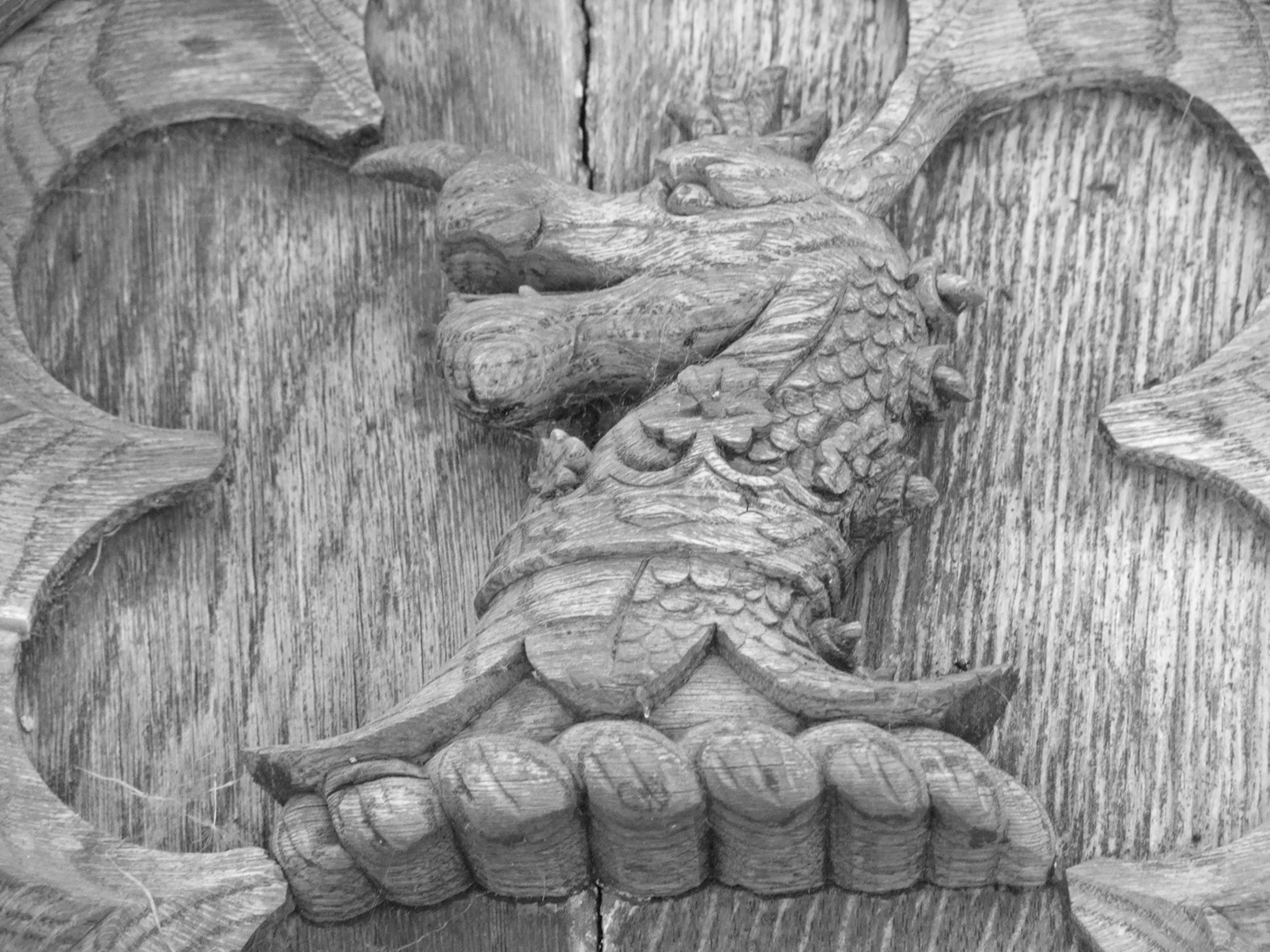 A beautiful church decorated with the arms and armorial symbols of its many owners and none more pronounced than the carvings on the west door or on the pew ends.