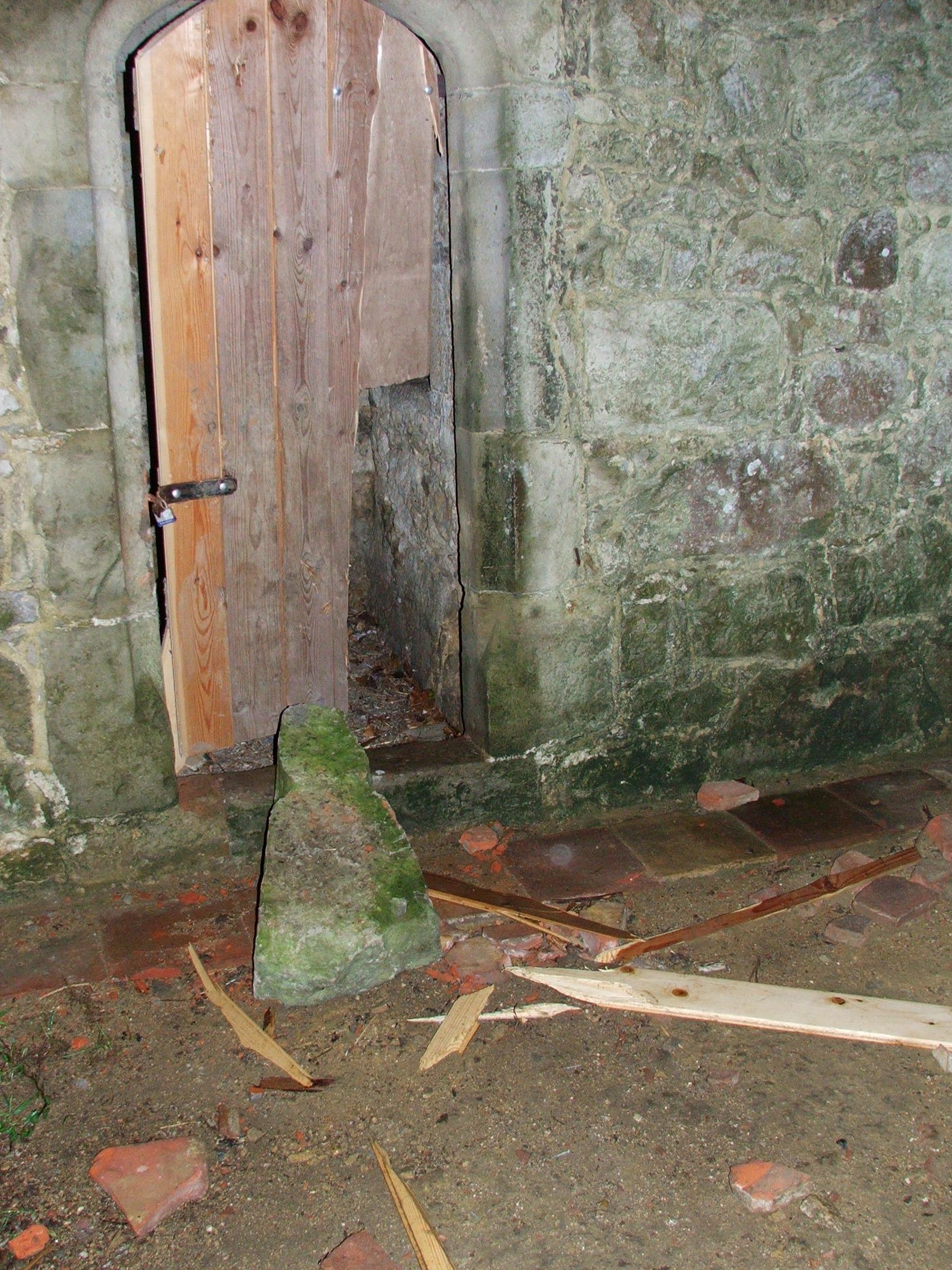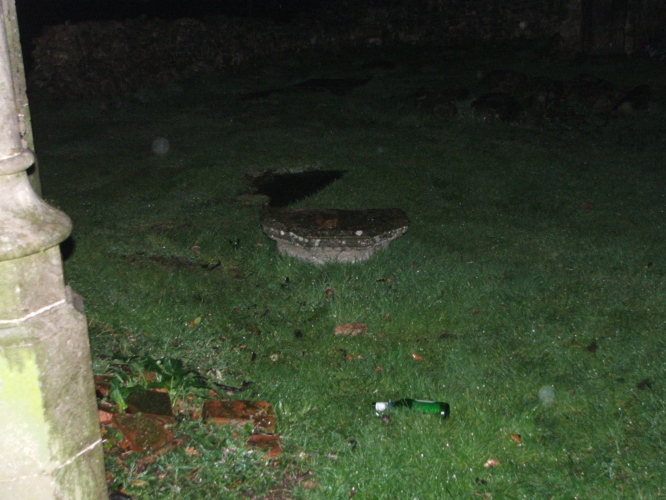 Using visual and scientific methods combined with spiritual information investigate the background to alleged paranormal phenomena at this venue. Investigation: The team relocated here after being rained off, unsually, at our previous location at the Roman Road and St Mary's offers a dry shelter under the remains of the tower. This investigation was also to be flawed! St Mary's is a favourite spot for congregating youths. Damage was found here by us in September and this night was to be no different. We found the previously damaged belfry stair turret door to have been forcibly battered from its fixings. What was even more disappointing was the manner that was employed. A piece of masonry of some weight had been used repeatedly to smash the door from its hinges after the lock and hasp failed to give way to the same treatment. It could not be identified where this masonry came from but appears to have been from the structure of the church itself. This, to us, makes this even more deplorable. We set up, in any case, to begin our investigation and dry out a little. This was interrupted later after little evidence being gained by three cars descending on the car park. A number of individuals then got out of their car, having parked either side of ours, and made their way up to the church not caring for the fact others were there. This intrusion on others privacy appears to be a par for the course here and happened on our last visit. It would appear that this is a common meeting place for persons of a