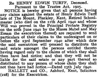 and Historical Society documents and can be easily researched. Our investigations established that Richard Buss was the miller from 1874 until the mill ceased grinding in 1916. This much is true. As can be seen there seems to be confusion among the versions of the story as to whether Henry Turff was the headmaster of Pluckley or Smarden schools or indeed if it were him that was The Hanging Man. We can settle this easily from the London Gazette of 19 July 1940.