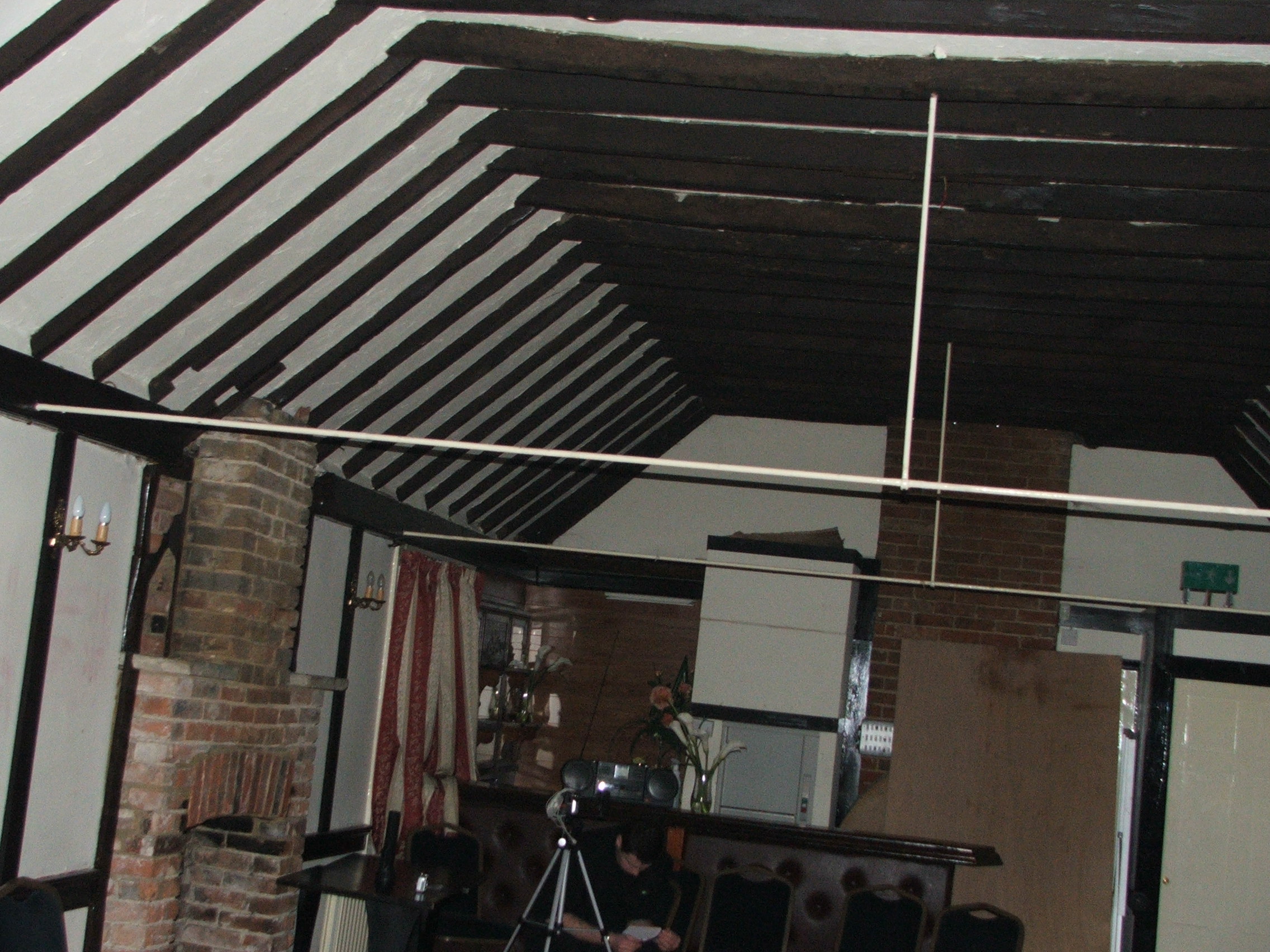 vague other than theatrical performances took place here in the 18th Century. Aim: To investigate reports of paranormal activity at The Kings Head public house. Background: There are very few reports available in any sources known to the Ghost Connections Team. However it has been stated by staff that the kitchen fryers were prone to switching themselves on after having been turned off at the mains and that glasses have been reported to have fallen by themselves from shelves around the bars. The second of these reports only came to the teams attention on the night of the investigation so no plans were made to investigate this report. Simon, the landlord, had invited the team out of interest and not through any substantiated reports. In the light of these reports the team decided to investigate for themselves if the Kings Head is subject to any of the alleged phenomena. Apparatus: Video camera- Digital Camera- Voice recorder - Team: Kim Guests: Anna Method: Using visual and scientific methods combined with spiritual information investigate the background to alleged paranormal phenomena at this venue. Investigation: Due to the opening times of the public house this was a late night start and the team had previously visited an outdoor location and arrived early at The Kings Head to warm up prior to the investigation. Thankfully the log fire was on and Simon greeted us and left us to set up and run through what we intended to do leaving Anna and Rob to accompany us for the night. A quick walk around established that the function room was not heated and on this night was substantially colder than the rest of the building. It was decided that this would be our first stop. Whilst setting the equipment up downstairs some distinct loud clicking sounds were heard from the top of the stairs to the function room. Initial investigation indicated this may have been the escutcheon plate fitted to the mortise locks on the door at the top of the stairs. Whilst having planned to investigate the function room first this only fueled our interest. We set up camera's and recorders in the function room and sat in various positions around the large room. It took us some time to get used to the sounds from the kitchen below but eventually these were all accounted for. The passing traffic could be heard distinctly and the lights from it formed obvious patterns against the curtains which we drew to keep as much light out as possible. There was a red IR alarm light above the door which would pick up upon Paddy's movement although we could not see his movements with the naked eye in the darkness. During the session here Rob would comment on a draft as though something was moving against his legs. There were no discernible drafts in this area. Paddy, sat with his back to the bar, senses a presence in or around the bar area. Kim felt tingles down her back which progress to intense coldness and her right ear feels burning hot. She then experiences a stabbing pain above her right kidney. Kim then experiences a headache in the area of her forehead. During this time Dave has been asking questions for any spirit answers and inviting activity. He pauses during this and Paddy asks that the questions continue. Simon is heard to leave the office part way through this vigil. The office is located off the staircase and he would later recount how he went downstairs to the pub and then up to the private rooms and to be. He states he was in bed when he heard us leave the function room. A further noise would be heard near the stairs after Simon left us. It sounds like something falling upon something else. No cause was found. After over an hour we left the function room and took a break by the fire to warm up before moving on. It was decided that the next area to investigate would be the rear bar / restaurant area. The team and guests sat around a table in this area to conduct a vigil by way of séance. Three video cameras and two voice recorders would be used to record the proceedings. It was noted that in the upper area of the restaurant there was a cat flap which led to outside. During the first session the resident cat would be heard to come in through the flap which was found to account for a couple of noises. He was seen to walk through the area and eventually settle on a chair that was within the teams view. No one else would be present in this area and there were no other animals in the premises. All outside doors were locked. There were various items of pub machinery located within the centre of the bar area for which the noises would be ascertained and noted. These would be discounted from any noises noted during the session. Kim feels extremely cold during this and drained of energy. Dave would feel his right arm raising from the table and pressure on his elbow from this movement. Kim, who was holding Dave's right hand, when asked about this, would not notice the movement on her left arm. Dave feels a draft across his left wrist. Paddy (to Dave's left) cannot state if this was his breath or not. After asking for some indication of presence a small noise is heard from an area off the of the raised area behind the team. A faint sound of two voices is likened by Dave to 'two blokes having a conversation'. The direction given for this is also that given by Paddy as a cold sensation. At this point the cat is seen and is known to be in. This discounts a couple of previous sounds believed to be the cat flap. Anna comments that her shoulder hurts. A temporary break is called after 50 minutes due to the team and guests feeling stiff and needing some exercise. After this short break the séance continued in the same location. When we re-started the cat would remain on a chair behind the team and be visible to all. Any further noises could be investigated. Paddy comments on a short pin prick type sensation between his shoulder blades. Opening the invite to join the team to spirit Dave mentions those who have given information before