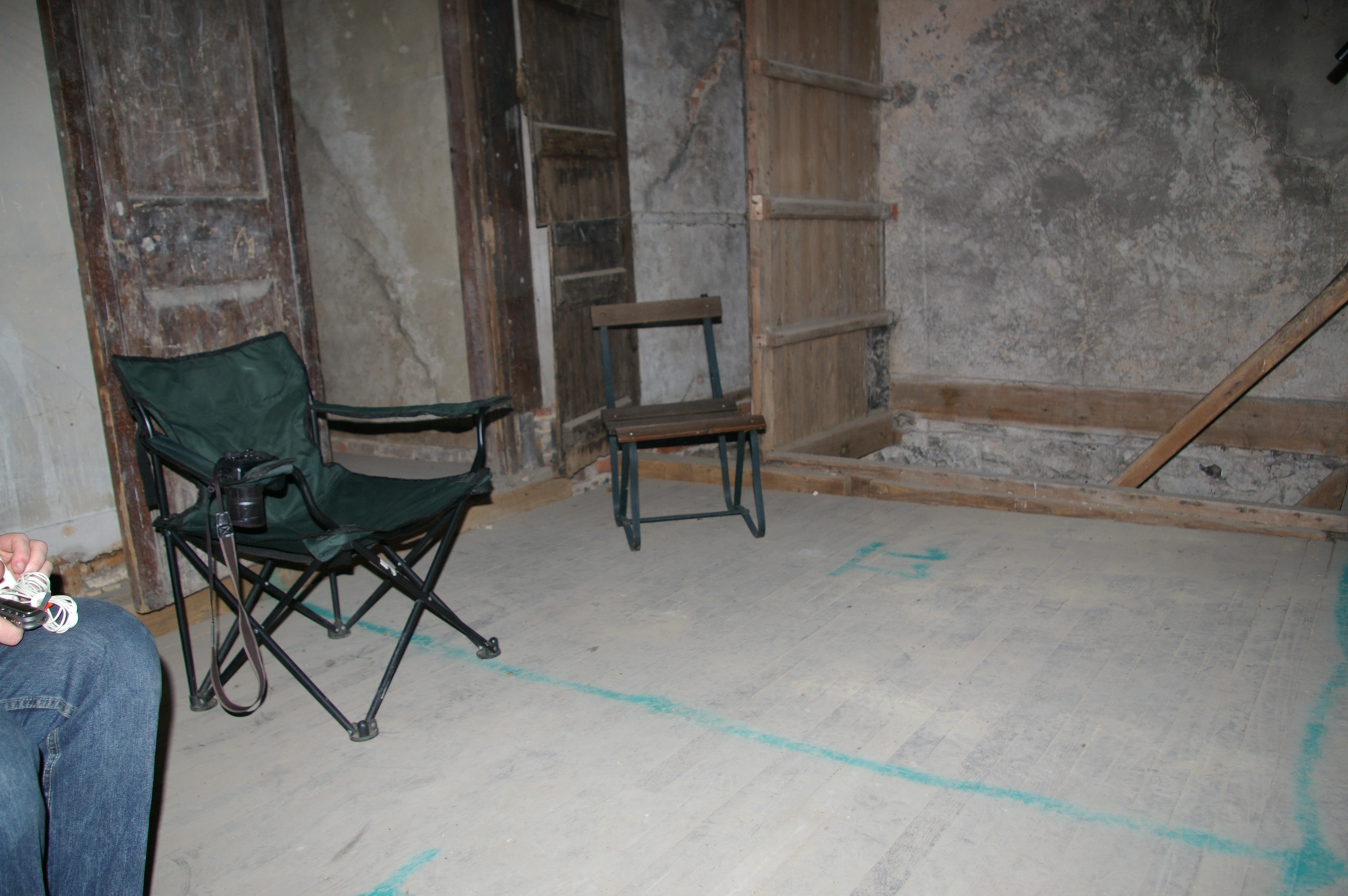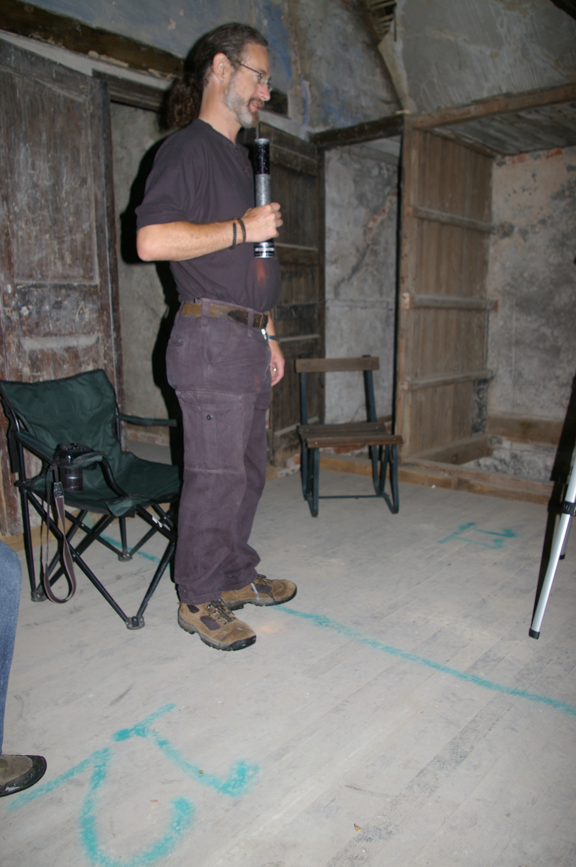 The investigation commenced in the outbuilding. We sat in the room at the top of the stairs as before, the same place as we had conducted our paired vigils on the second investigation. Dave's camcorder pointing downstairs, Ian's into the adjacent room, Paddy, Kim and Dave's voice recorders were all sat around the floor and running. After a while Ian and Dave began to take turns talking, announcing us and asking for anyone with us to make themselves known. It seemed that no sooner had we started there were noises and taps to be heard all around us where there were none as we settled for the start. The atmosphere became very dense and heavy. Whilst Dave was calling out Ian felt the most intense wave of coldness, right to the bone making every hair on his body stand on end then it subsided, this happened two or three times whilst Ian asked Dave to continue talking as Ian felt sure this was a response to what Dave was saying. Ian also noted seeing some faces in the shadows by the top of the stairs, not in any great detail but the “disc” of peoples faces fading in and out. Kim noted a couple of taps heard by the team and she felt a “touch” behind her ear, which made her jump. Dave was to also have the same thing happen to him. Kim also noted seeing a strange light by the stairs as if something was moving about, then both she and Paddy witnessed another flash that moved over towards the stairs again. Dave noted the sound of movement as if someone was walking into a sold object, then felt a cold draft of fresh air across him. Clicks to his left as he was looking in that direction and during a moment when Ian was making a request for some activity Dave heard a distinct groan, as though in dismay at Ian's request. Dave describes hearing further taps of a metallic nature to his left then sees movement across the doorway of the adjacent room, where Ian's camcorder is pointing. He described it as a group of pinprick lights but together giving the outline of a flowing light or white gown. Only the bottom half to the floor was visible, nothing was seen where the torso would have been.
