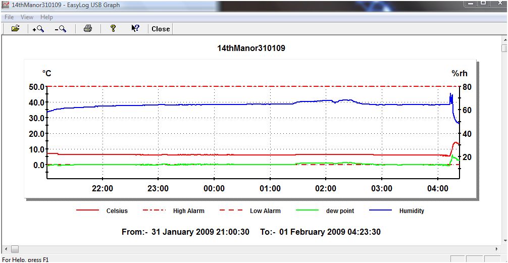 why Kim became nauseous. When the team investigated what could have caused the light Kim saw against the wall in the center bedroom, it was found to be that there was no nearby road from which car headlights could have shone. Neither was there any other possible external light source. It was also found that the windows were glazed with plain glass and not leaded! We were unable to explain the source of the illumination or why Kim saw the shadow of leaded lights windows against the wall. Some of the noises heard by the team whilst on the stairs were caught on camcorder but unexplained. The loud crack heard and the rustling that followed was to be investigated later. The noises heard from the hallway whilst in the kitchen were very similar to those heard whilst we were on the stairs. These were investigated but no cause could be found, some were caught on camcorder. Likewise the noises heard from the kitchen whilst we investigated the earlier noises could also not be identified. We are aware of a fridge in the kitchen that produces some noise but not the type of noises we had experienced, neither were they coming from the location of the fridge so these noises are also unexplained. The sound of movement and rustling heard in the rear hallway and further into the house may have an explanation, as when the team returned to camp Dave saw a rat run across the room, we can only assume the rustling was the rat rummaging in the bags about the place. The Camcorder that was locked off in the first floor corridor produced no evidence but for the first few minutes of filming it was subject to some strange interference. As you watch the footage you are aware of the image moving as though the camcorder is being touched or played with? We have no explanation as to why this happened. A certain amount of other information was forthcoming to the team of a clairvoyant nature. As Ghost Connections conducts scientifically based investigations we do not publish such observations, however, this information is held on a separate database. Should you wish to discuss this information please email us. Most of our camcorder footage, still photographs and voice recordings have been examined and items of interest have become apparent. Some of those moments were caught on camcorder or audio including the repeated knocks (possible footfalls) heard in the Victorian bedroom, these and can be seen in the videos that accompany this report. This report will be updated should anything further become evident. Data Logger Results from Stairs to Pink Room - Rest to follow.