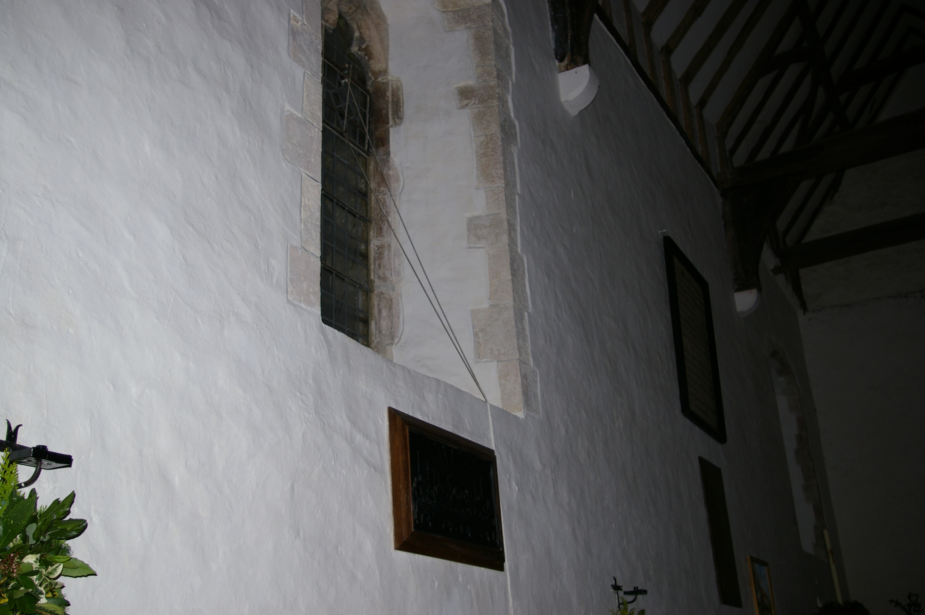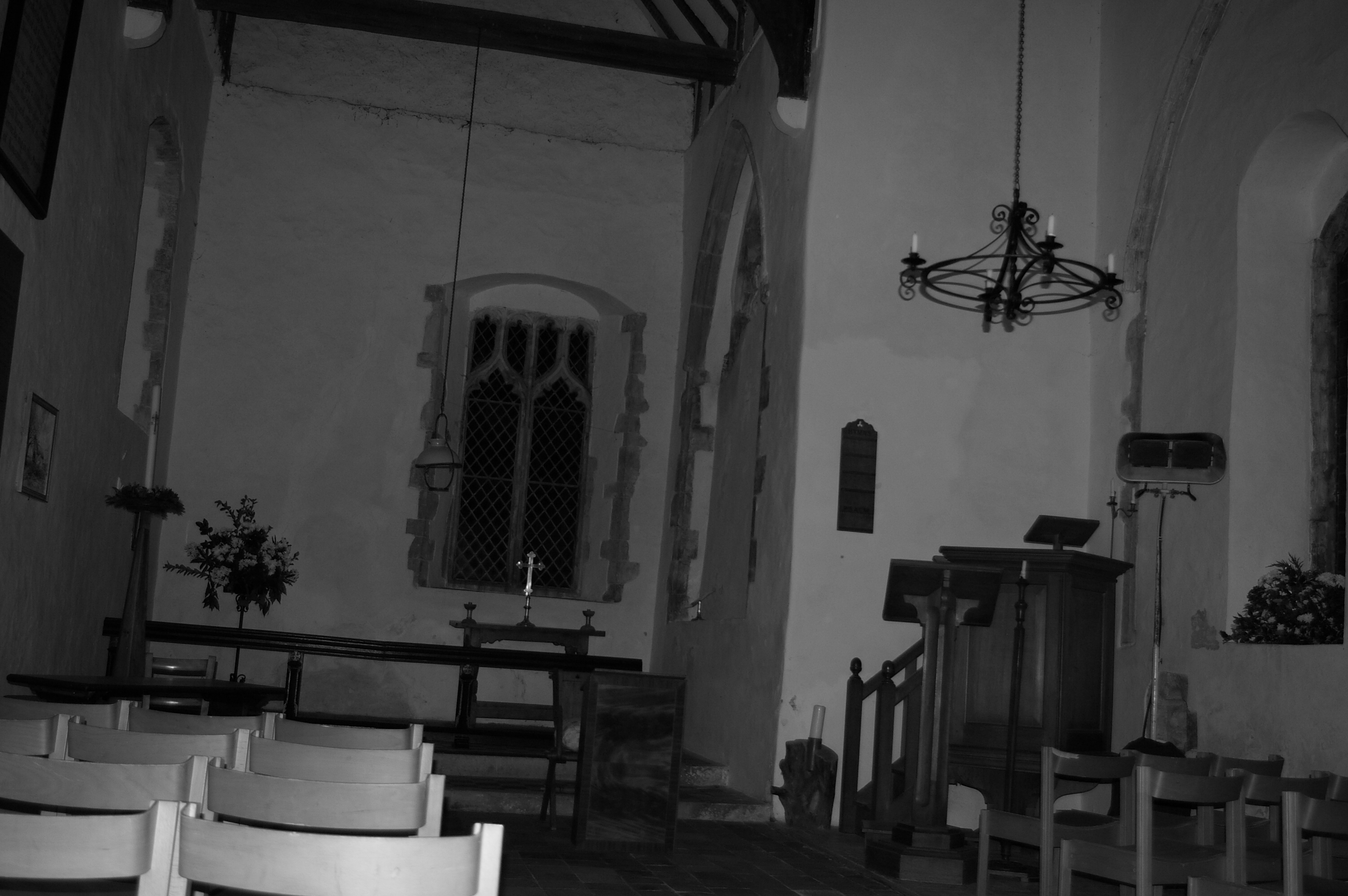 entity? We cannot say. The screeching noise was identified as the weather vane atop the tower. The cause of the sheet of light was found to car headlights along a lane some distance away. The cars could not be heard by the team but the lights appeared to shine through a South window and project onto the North wall. No source was found for the sound near the pulpit. Nothing was produced in the photographs taken of the aisle to support Dave's suggestion. The tapping noise on the south window was investigated and it was found that there was a cracked pane of glass in this window. It may be that the slightest wind was causing the two broken parts of window to rattle against each other so that the tapping noise was produced. The sound of the water drip did not come from any known source. There was no wet patch on the floor and neither was it raining outside. It remains impossible to speculate on this as no repetition was forthcoming. Paddy's physical sensation of a stroke or similar is difficult to explain. It is possible that similar symptoms can be felt through auto suggestion although this generally requires some kind of stimulation as in previous knowledge of a location or person. In this case neither were available and cannot be explain. The 'huff' heard by Dave is not explainable. The team deny causing it but it was perfectly audible. The sound of bodily noises is an often reported paranormal phenomena. In this case we cannot say it was paranormal but know that no one else was with us and yet none of us made the noise. What is interesting about this evening was the desire by Paddy and Ian to do something overwhelming. They both felt the need to either move or sit somewhere particular. This is not the general make up of the team or a normal reaction seen on investigations. Having said this it does draw certain parallels with another recent church investigation where Dave had an urge to move about constantly. Another pending church investigation will be interesting to see if something similar occurs. This has never happened in other premises. During our stay a certain amount of other information was forthcoming
