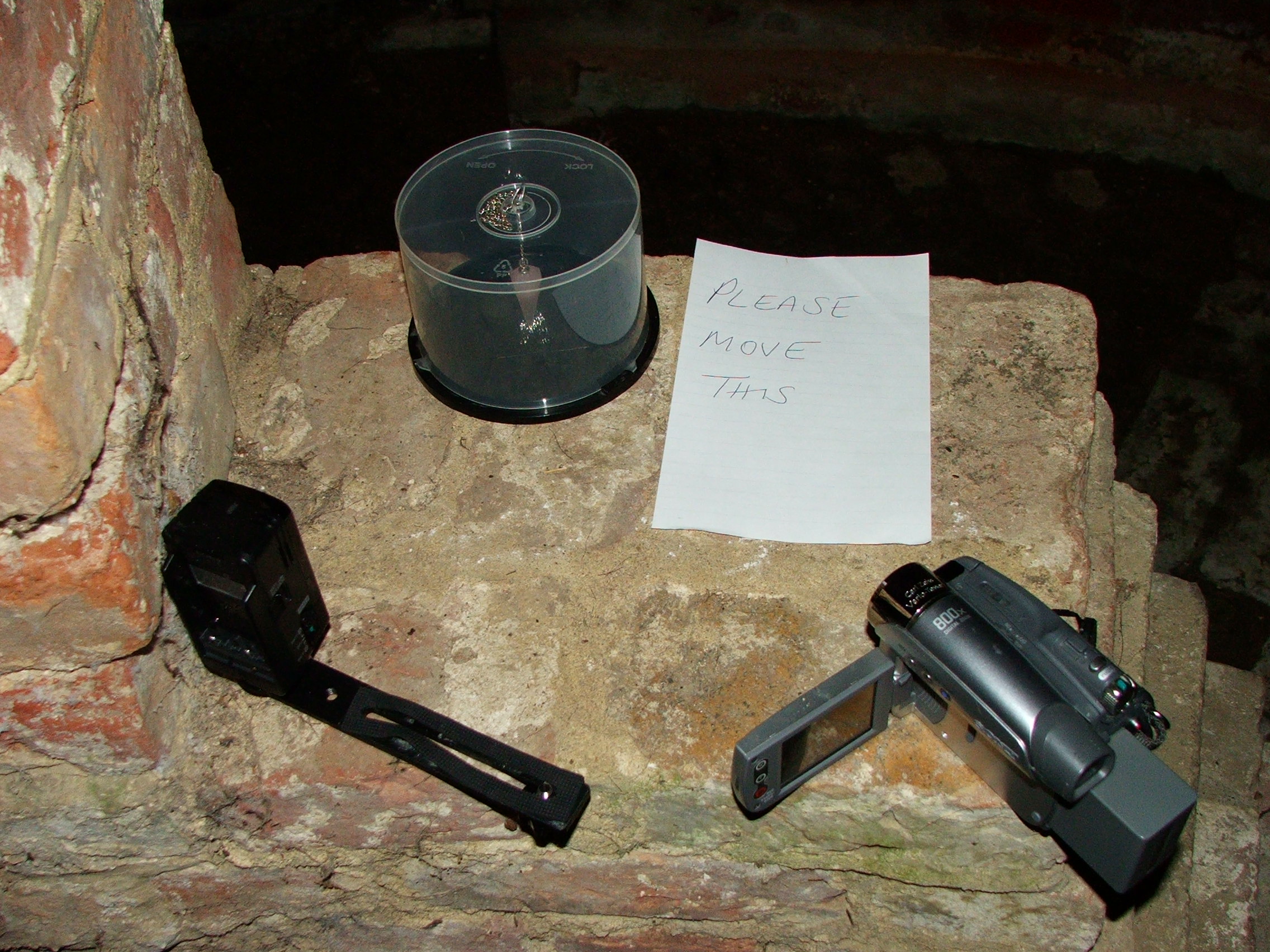 There was one area of building B that had not been investigated in any detail before although indications of unexplained noises had been heard there on previous occasions. It was therefore decided that the evening would focus on this area. It is an attached part of building B and only accessible through building B. It is only safely accessible through building B's ground floor door although a first floor level exists. At the top of this structure is a venting system which is controlled specifically by the exterior environment change and consists of a large device mounted on a fully turning system anchored internally by a wooden beam structure. This was note to creak and bang as it moved. Once we had noted the sounds from here we could then eliminate them for the rest of the evening. This evening would also see the deployment of a newly developed 'sterile' pendulum experiment see below - The new experiment consists of a pendulum suspended within an airtight container. Placed on a horizontal surface and left untouched it was recorded throughout the evening by one video camera. A separate IR light was placed at an angle as seen above in order to highlight the pendulum without causing glare into the camera from the surface of the container. An addition to the experiment was a hand written note saying simply 'Please move this'. Our theory behind this being that, save us keep drawing attention to the experiment, anyone else present may be able to read the note and move the pendulum. All footage would be reviewed for results. To have described this first is to have missed the initial events. Paddy arrived first and hears 'She's here' repeated time and again within the enclosed area between building A and B. Initially we opened building A and turned the lights on for a walkaround before turning them off having decided to actually investigate building B first. During the walkaround in building A Paddy described a female with long dark hair of unkempt appearance. She has a wild look about her. She is aged about mid 20's, slim and quite tall. She was seen as a reflection in one of the windows standing behind Paddy. Moving back to the main subject (building B). We set up the equipment with the experiment running and Ian's camera on a tripod filming under an arch structure in this room. We arranged our chairs around the perimeter facing into the centre. We could not reach or see the experiment. The light from Dave's camera filming the experiment would give some illumination of the area behind and allow us to see some of the room unaided. Ian put new batteries in his camera before arriving and these were found to be flat and needed replacing. In this area there were various sensations of other people being present and sounds of movement like shuffling were commented upon as though it were on the ground floor where we were. Nothing was seen with the naked eye to support this and the area was completely visible to us. Both Paddy and Ian comment on hearing footsteps at differing times whilst setting up and Ian hears a shuffling sound. The wind could be heard outside and was responsible for some movement in the device already described on the roof of the structure. Ian describes one of the knocks and then there are a series of more. The team return to the same place and further shuffling noises are heard within the same area. A 'tap' is heard in the main area of the building. Paddy hears another exhale of breath. At one point more than one member of the team would comment on red pin pricks of light being visible in the area of Ian's camera. At this precise moment there was the sound of a click as though something had walked into his metal tripod. As the team discussed the lights another was seen by Dave brighter and further down on the internal wall structure. Kim hears taps by the door which are also noted by Ian and Paddy. Paddy notes the sound of an exhale of breath. Dave also comments on a similar noise but no one in the team admits doing so. Part of the internal wall has a hatch in it and Ian notes that he believes we are being watched by something through it. More shuffling in the arched area is heard. Repetitive noises are heard for a short period upstairs in the main building. The team take a break. During the break Paddy sits within his car writing up his notes and records that he hears what sounds like someone leaning on his car bonnet although nothing is seen. The team returned to the same place. Further sounds of movement were heard either in the tunnel or upstairs but could not be placed. Dave and Ian changed tapes in their cameras and I changed position of his to view into the main building due to the noises being heard there. Paddy heard some banging in the main building then went to investigate this. A lot more banging was heard from overhead and it was decided that the lights would be turned on for a spell to be able to try to ascertain the cause. A further break was taken. Paddy left the investigation at this point. The last session was draining so the team decided to change location to building A. The pendulum experiment was moved from the previous location to building A on a firm table and recording started. A voice recorder remained in the previous location. Once in building A the door was slammed shut violently. A fire extinguisher was put against it to keep it to. The wind can be heard outside across the roof. A creaking noise was heard from across the bay. A distant squeak noise was heard. A repeated noise like a ratchet on a spindle was heard clearly within the building. An object moved nearby. Repetition of noises was requested and a single tap was heard on a roof rafter. Further noises and bangs were heard within the building. Further repeats were requested but these were irregular although some were timed immediately after the request. Two repeats were asked for and two were produced. Ian asked 'Was that two?' and was immediately followed by two taps. Further repeats were asked