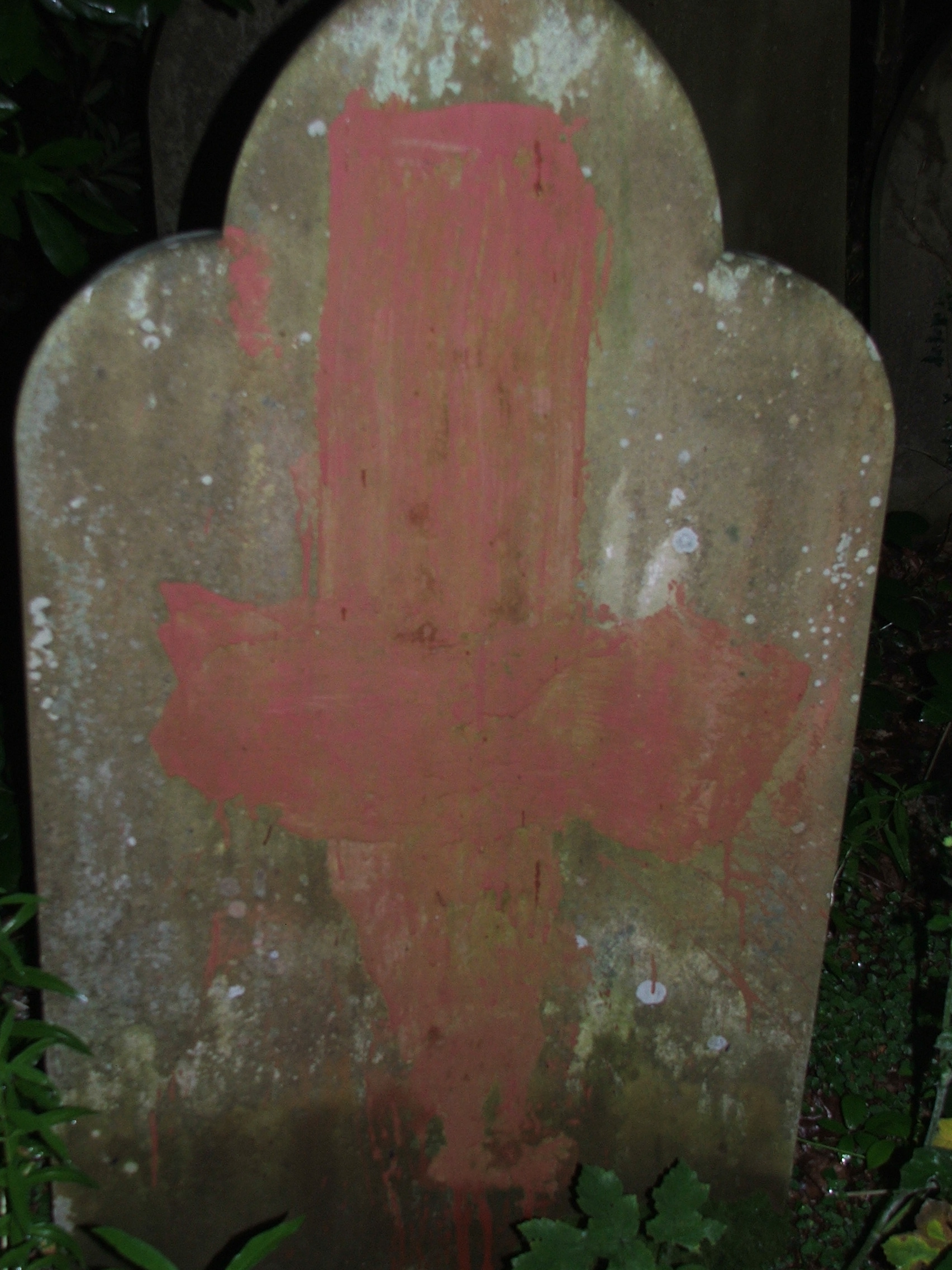 What we did find, however, was a headstone daubed in red paint in the figure of a cross. Occasionally we have come across signs of occult activity or its make believe counterpart, in the name of childish tomfoolery, so what was this – black arts or blatant vandalism? We think the latter