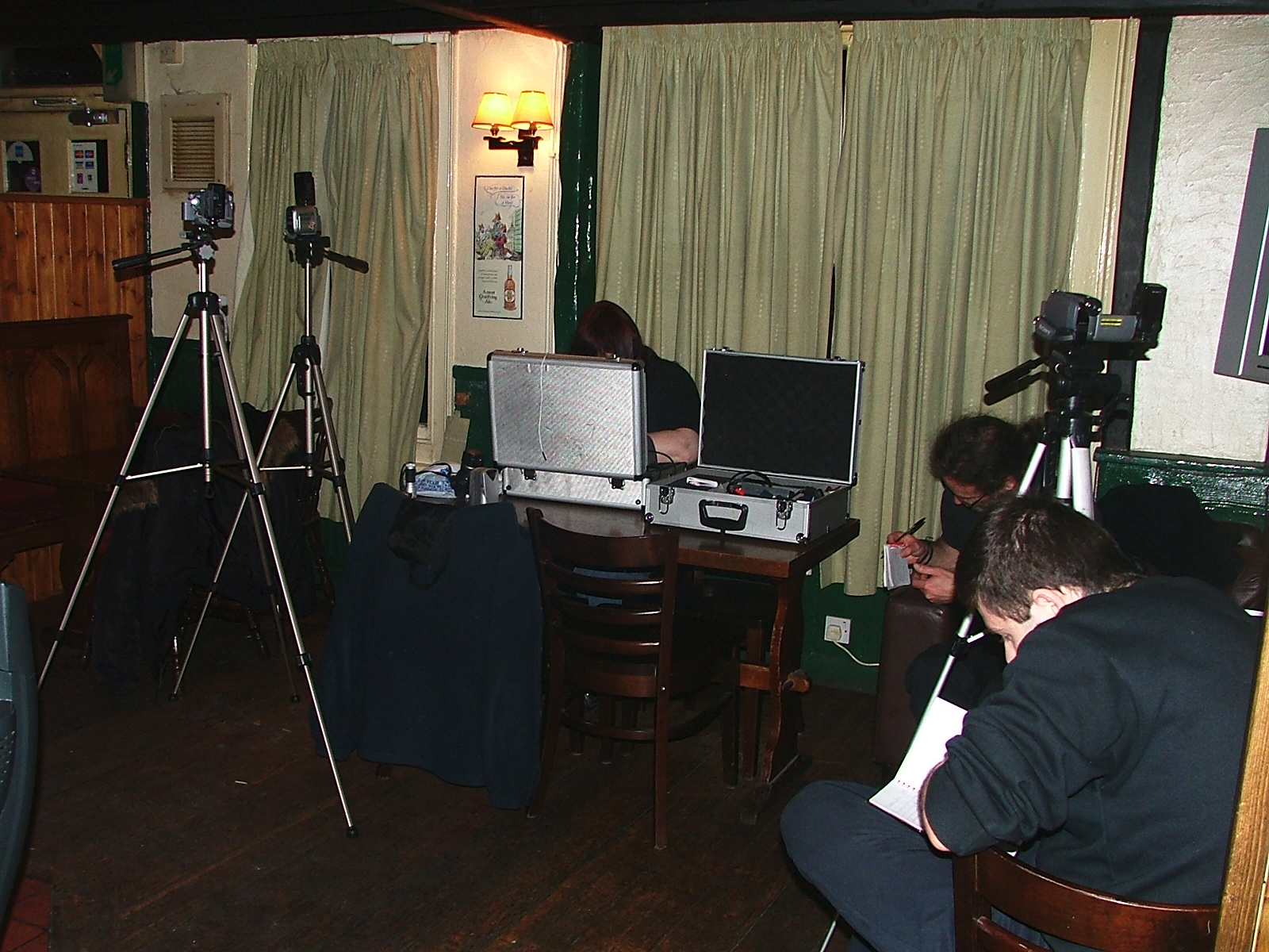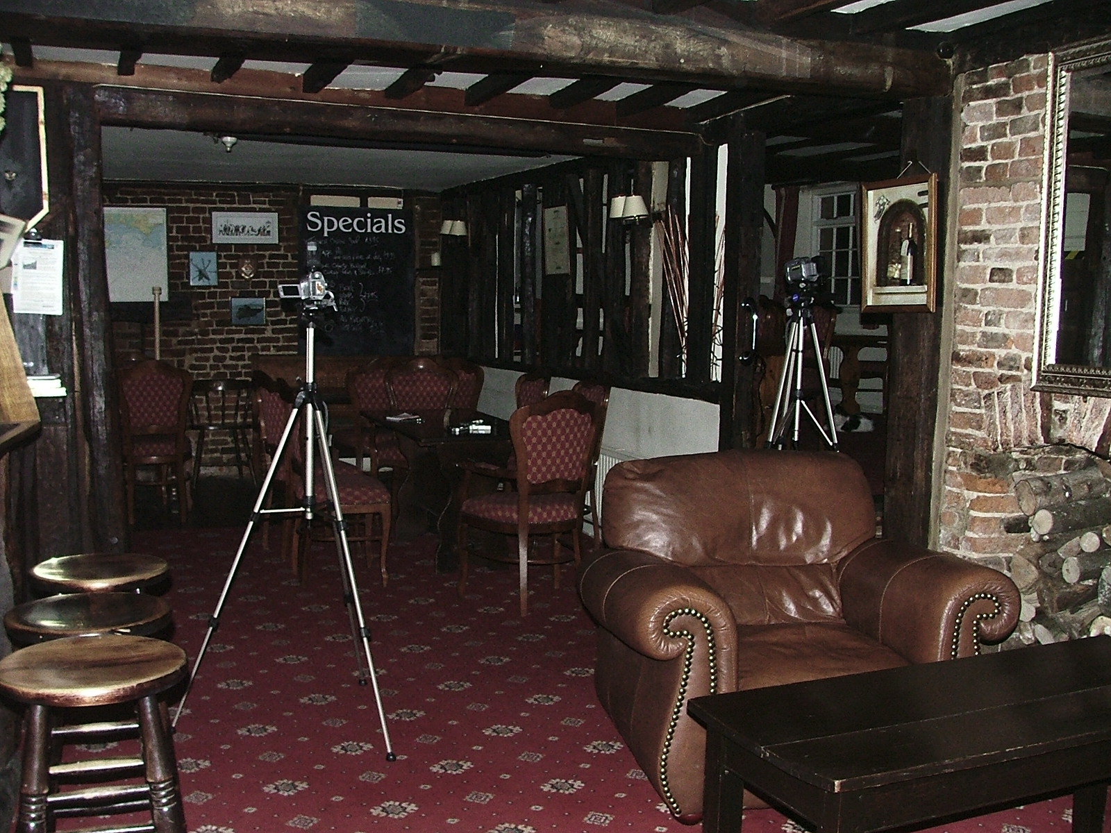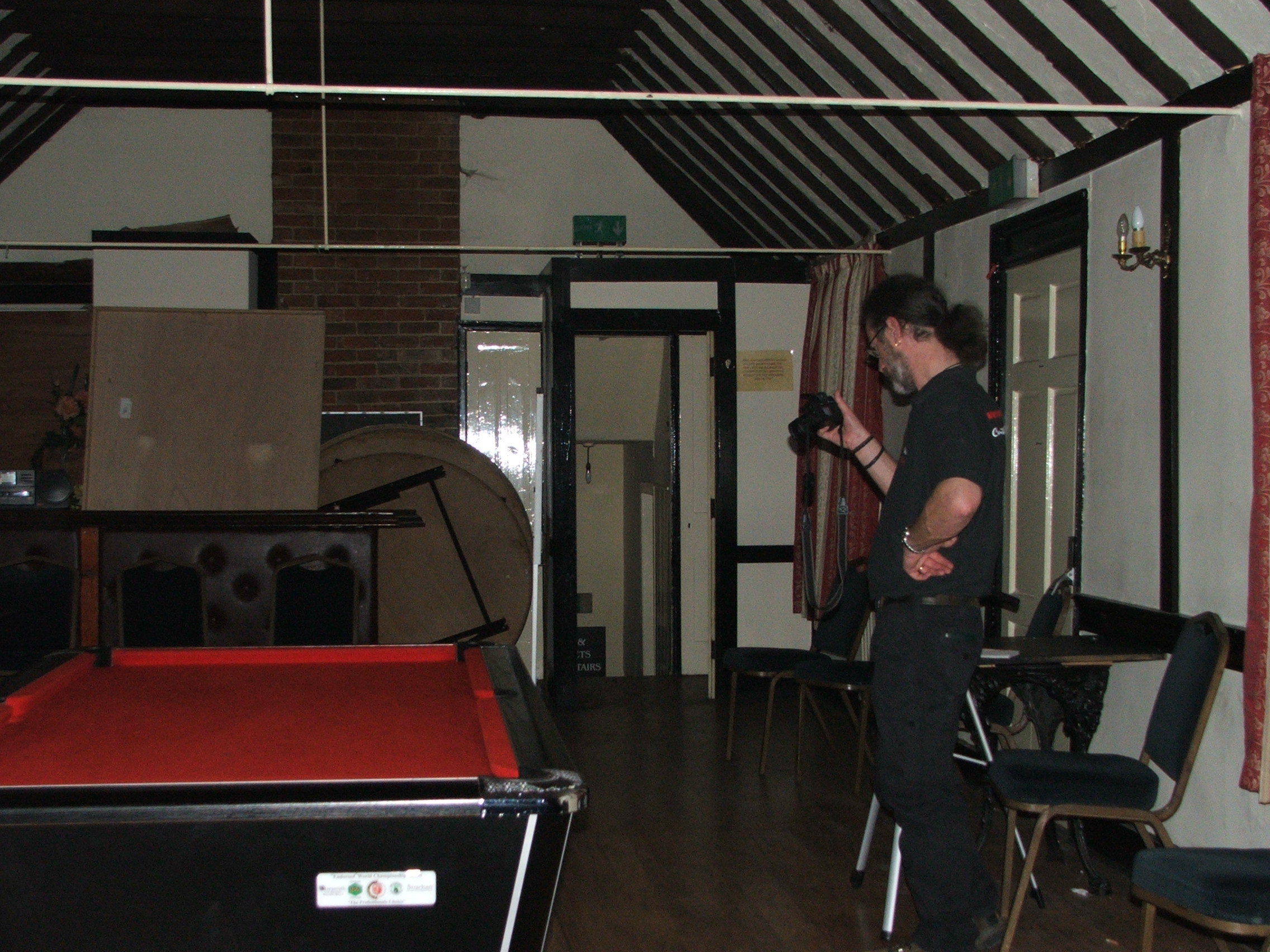 Some time was spent listening to the natural sounds both inside and out and becoming accustomed to the lack of light. After some time Dave called for any persons to make themselves known. Kim notes a nervous feeling in her stomach. Emma (sitting two seats from Paddy) states that she feels colder. Half an hour had elapsed and the temperature generally in the room was now 21.06deg C. All of us would hear a series of noises. Paddy notes one as sounding like a small animal running. Others hear a dull thud in the area where Paddy is seated. Another is heard further towards the centre of the room near the pool table (a distance of about 6-8 feet from the first). During this experience a noted drain of energy was drifting through the team. Both Kim and Dave would feel this. A plea is made for the noise to be repeated and nothing is forthcoming although Paddy comments that he sees movement out of the corner of his eye. This is not limited to one location. Emma agrees with this. Temperature remains at 21.06deg C. Another 'thud' is heard nearer to Dave than the last. The noise is of the same volume and tone on each occasion and it is noted that it occurs at regular 5 minute intervals. After 1 minute there is another similar noise. There is no further noise for 17 minutes when another occurs near Dave. In the intervening 17 minutes Kim feels colder and nauseous. Dave sees a small green light travel diagonally bottom right to top left against the wall paneling to the right of the fireplace near to Paddy. Paddy notes a tap from the area of the fireplace whilst noting the appearance of shadows of persons. The temperature was noted to have risen again to 21.6deg C. Paddy would note the sense of a large man behind the bar, which was immediately behind him. Paddy would then describe the feeling of a presence to Dave's left and a few 'Corner of Eye' movements. Clairvoyant information was forthcoming at this time. A slight tap was heard by all again but the team were unable to come to a conclusion as to where this was. Paddy notes the presence of more shadows. The temperature was now 21.4deg C. A photograph of the area where Paddy and Emma were sat is produced below. The team then took a break and discussed their findings. Simon retired to bed and Emma wished to remain with the team for the rest of their investigation. During this break the temperature in the bar was noted to be 23.7deg C. It was decided that the next area to investigate would be the rear bar / restaurant area. The team with Emma sat around a table in this area to conduct a vigil by way of séance. Emma would observe from a seat at the same table. Three video cameras and a voice recorder would be used to record the proceedings. The fourth camera was set up to record a set of bar skittles which were set up as a possible trigger object / focus for poltergeist activity. The other voice recorder was left to record in the front bar. The temperature in the restaurant was 22.3deg C. The team joined hands observed by Emma and the séance began. All of the team (except Kim who has her back in this direction) would note shadows moving around towards the window nearest the sofa and ladies toilet. Paddy would comment that he saw hands entering the circle created by the séance. This reminds Dave of old accounts of seances during the 1920's where 'materialisation' of hands are alleged. It was decided to focus the energy on this aspect in an effort to see if this could be replicated. A number of noises would also be heard from the area of the bar. Emma comments that on two occasions she heard murmering like a group of people talking in the distance and this is supported by Paddy. After a break a final séance would take place in the front bar area. By now it was late and some of the team were tiring. Emma remained with us and joined in this time. Nothing was noted although the temperature was now 21.07deg C.