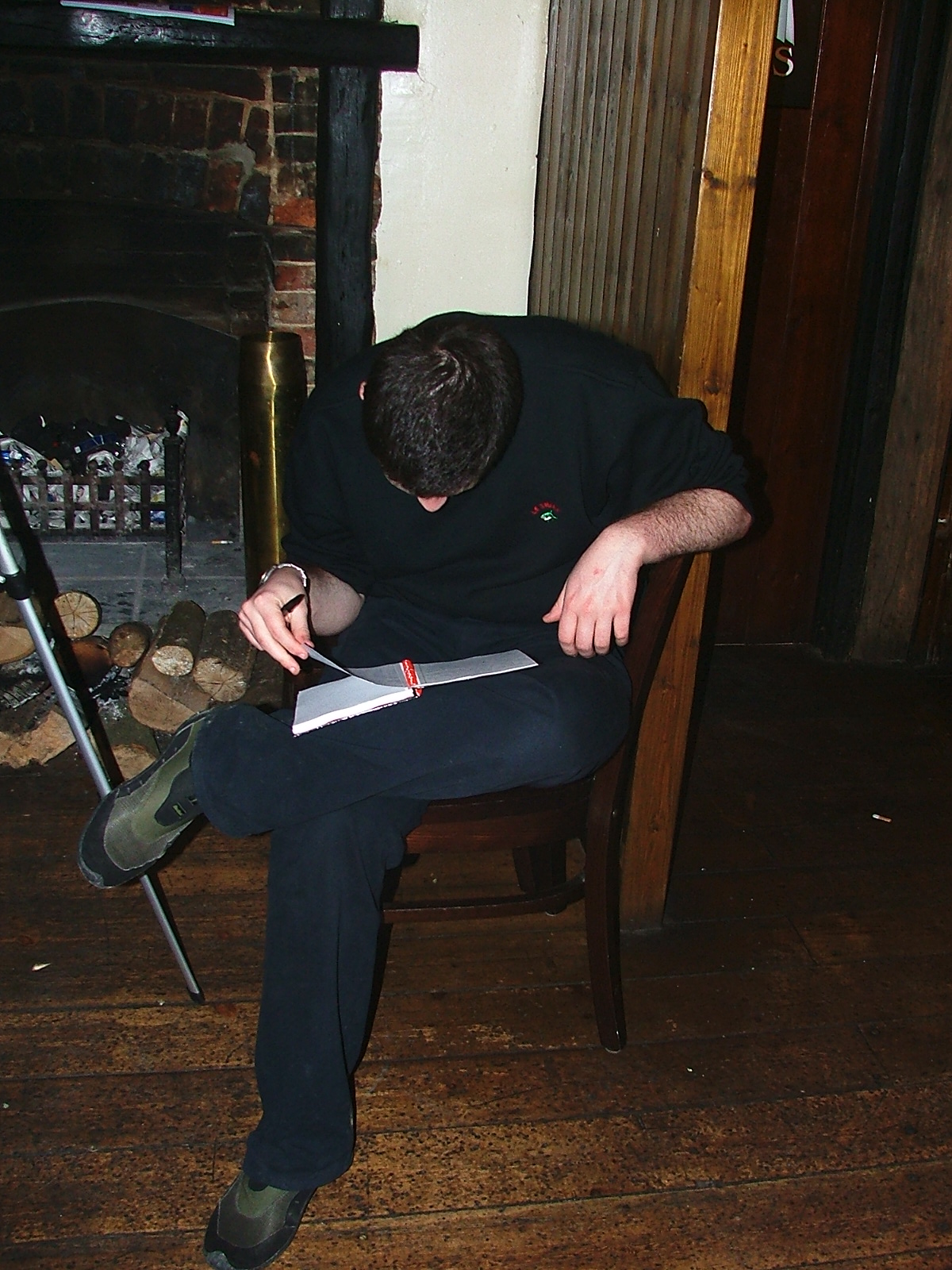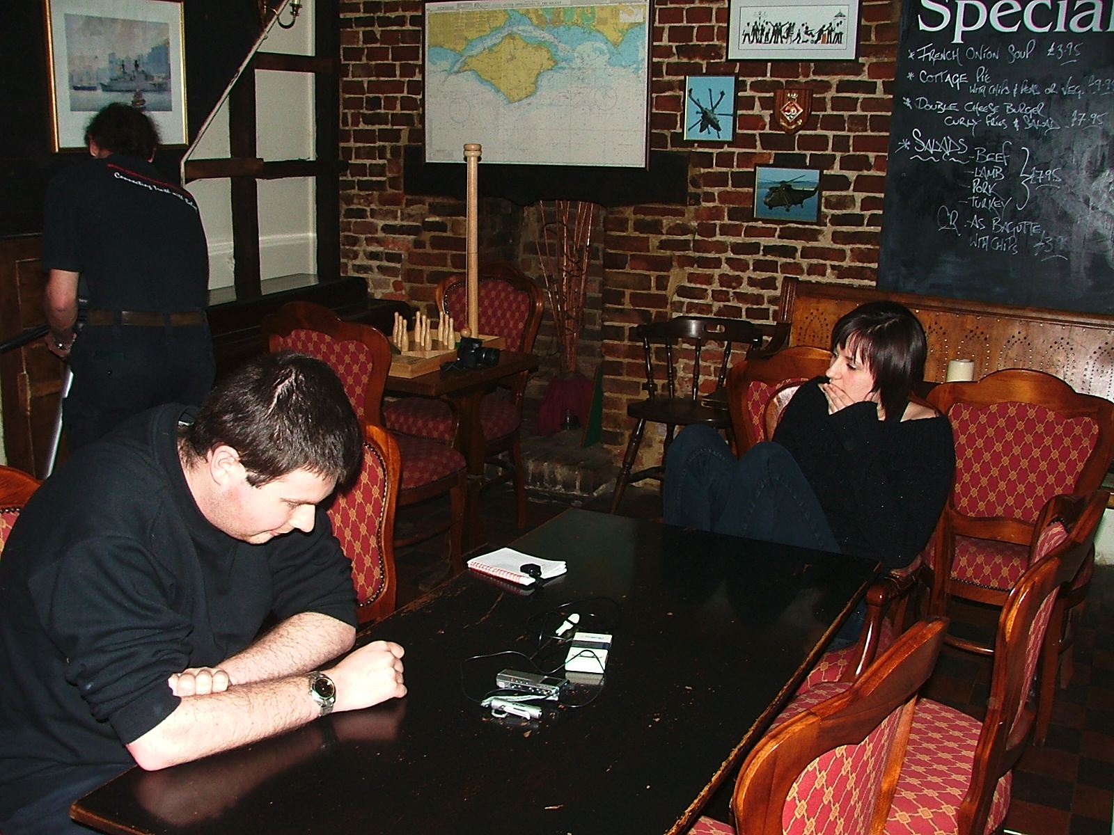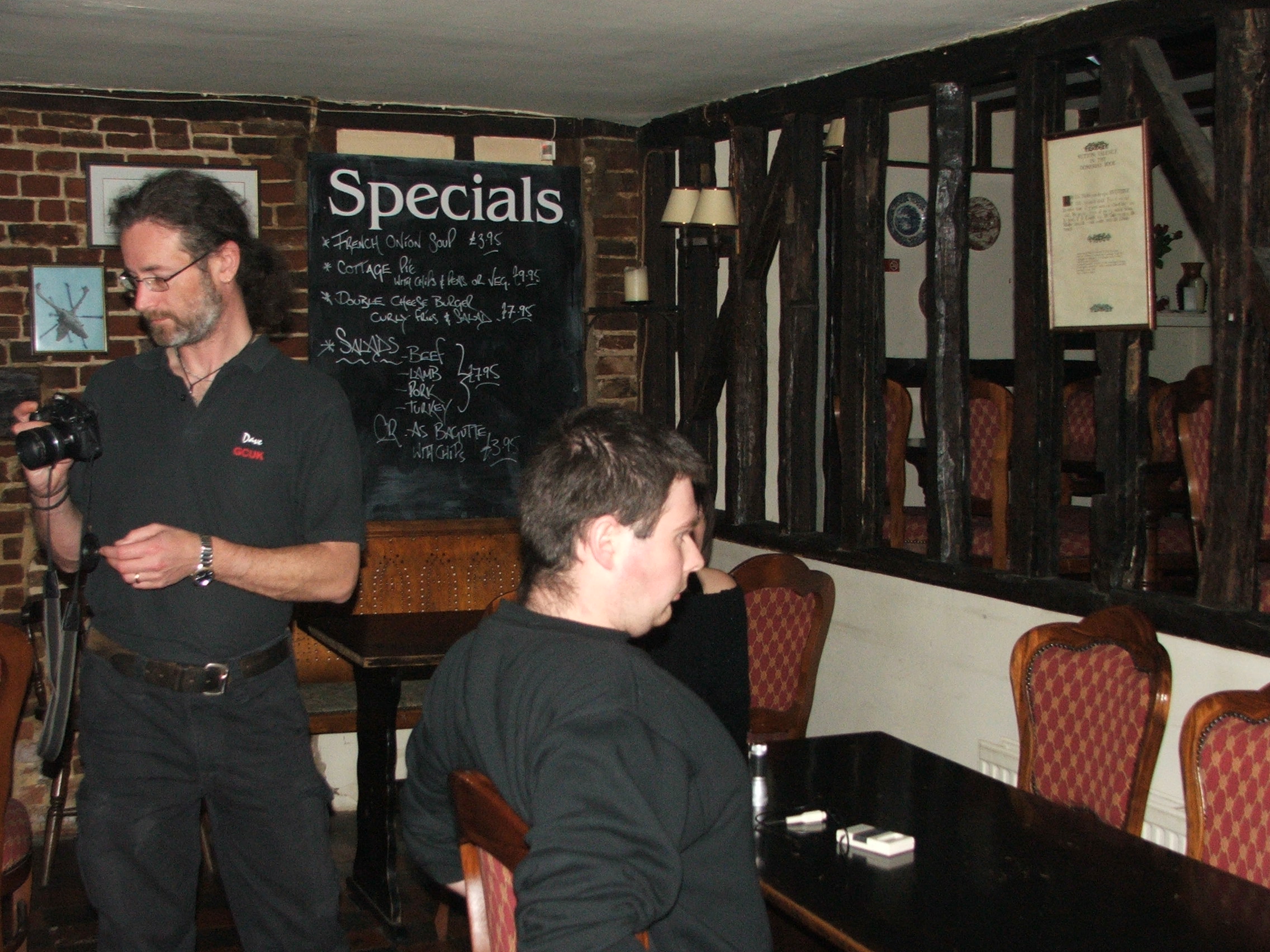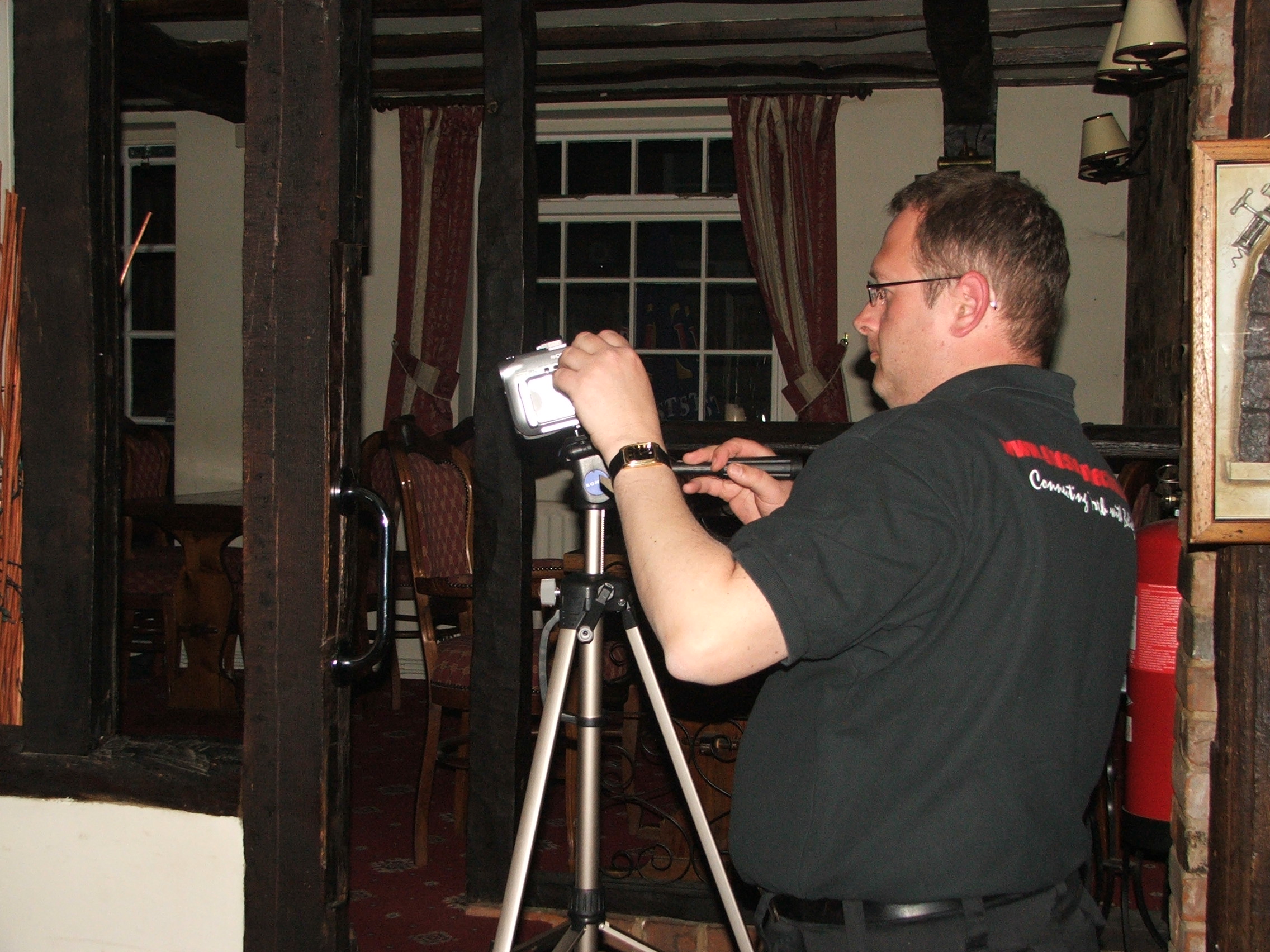 Some time was spent listening to the natural sounds both inside and out and becoming accustomed to the lack of light. After some time Dave called for any persons to make themselves known. Kim notes a nervous feeling in her stomach. Emma (sitting two seats from Paddy) states that she feels colder. Half an hour had elapsed and the temperature generally in the room was now 21.06deg C. All of us would hear a series of noises. Paddy notes one as sounding like a small animal running. Others hear a dull thud in the area where Paddy is seated. Another is heard further towards the centre of the room near the pool table (a distance of about 6-8 feet from the first). During this experience a noted drain of energy was drifting through the team. Both Kim and Dave would feel this. A plea is made for the noise to be repeated and nothing is forthcoming although Paddy comments that he sees movement out of the corner of his eye. This is not limited to one location. Emma agrees with this. Temperature remains at 21.06deg C. Another 'thud' is heard nearer to Dave than the last. The noise is of the same volume and tone on each occasion and it is noted that it occurs at regular 5 minute intervals. After 1 minute there is another similar noise. There is no further noise for 17 minutes when another occurs near Dave. In the intervening 17 minutes Kim feels colder and nauseous. Dave sees a small green light travel diagonally bottom right to top left against the wall paneling to the right of the fireplace near to Paddy. Paddy notes a tap from the area of the fireplace whilst noting the appearance of shadows of persons. The temperature was noted to have risen again to 21.6deg C. Paddy would note the sense of a large man behind the bar, which was immediately behind him. Paddy would then describe the feeling of a presence to Dave's left and a few 'Corner of Eye' movements. Clairvoyant information was forthcoming at this time. A slight tap was heard by all again but the team were unable to come to a conclusion as to where this was. Paddy notes the presence of more shadows. The temperature was now 21.4deg C. A photograph of the area where Paddy and Emma were sat is produced below. The team then took a break and discussed their findings. Simon retired to bed and Emma wished to remain with the team for the rest of their investigation. During this break the temperature in the bar was noted to be 23.7deg C. It was decided that the next area to investigate would be the rear bar / restaurant area. The team with Emma sat around a table in this area to conduct a vigil by way of séance. Emma would observe from a seat at the same table. Three video cameras and a voice recorder would be used to record the proceedings. The fourth camera was set up to record a set of bar skittles which were set up as a possible trigger object / focus for poltergeist activity. The other voice recorder was left to record in the front bar. The temperature in the restaurant was 22.3deg C. The team joined hands observed by Emma and the séance began. All of the team (except Kim who has her back in this direction) would note shadows moving around towards the window nearest the sofa and ladies toilet. Paddy would comment that he saw hands entering the circle created by the séance. This reminds Dave of old accounts of seances during the 1920's where 'materialisation' of hands are alleged. It was decided to focus the energy on this aspect in an effort to see if this could be replicated. A number of noises would also be heard from the area of the bar. Emma comments that on two occasions she heard murmering like a group of people talking in the distance and this is supported by Paddy. After a break a final séance would take place in the front bar area. By now it was late and some of the team were tiring. Emma remained with us and joined in this time. Nothing was noted although the temperature was now 21.07deg C.