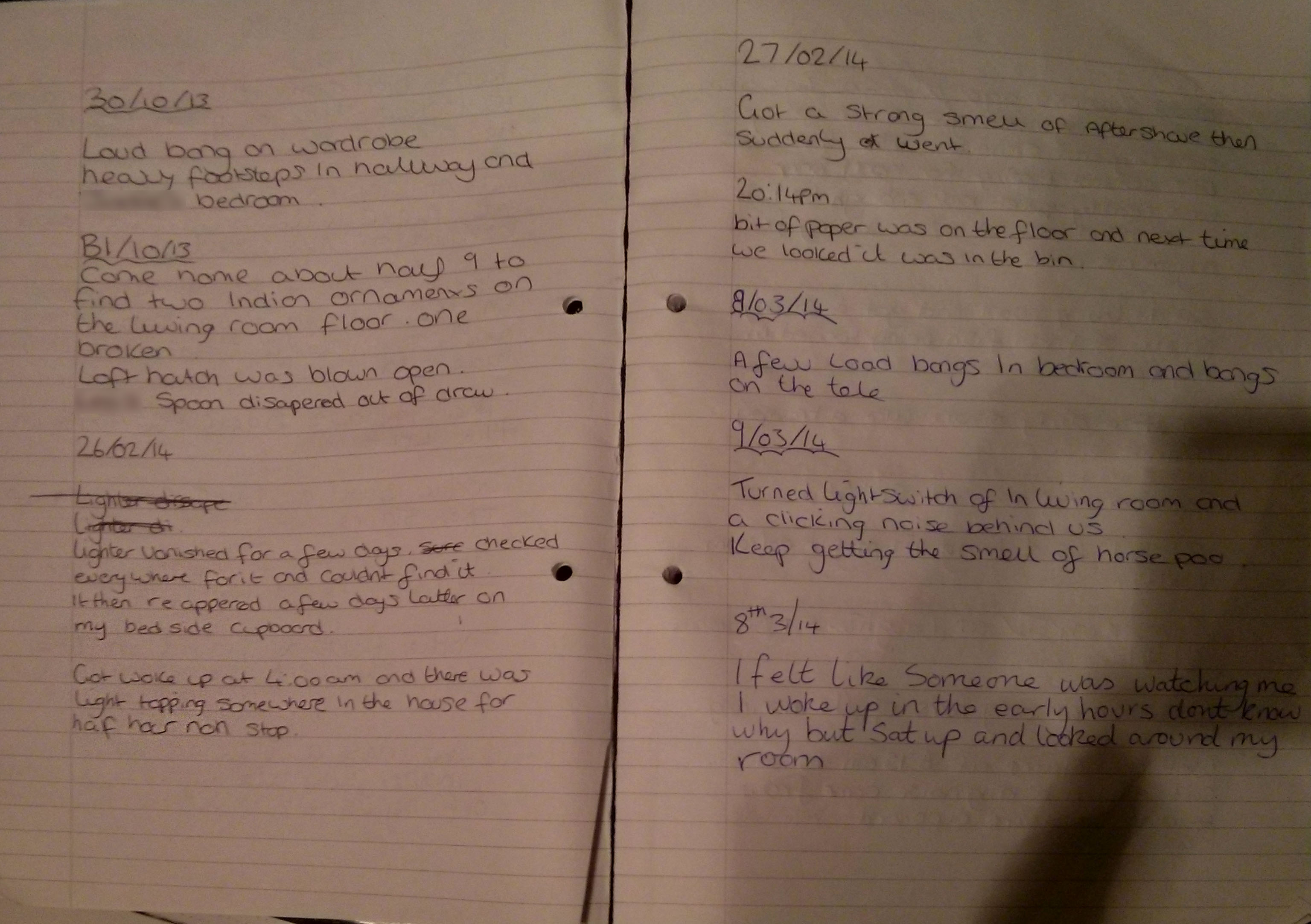 After an initial period of discussion, and noting the noises through the wall from the neighbours house Graham noted that a draught had developed across his legs where he sat on the sofa between Kim and Paddy. Neither Kim nor Paddy seemed to notice this although Dave, sat separately on the floor, also commented on the faintest of draughts now detected at floor level. After some twenty minutes the first noise within the investigated premises was heard. It seemed to come from upstairs followed shortly after by another. Dave observed a small light move across the coving on the ceiling. A further noise was heard and believed to come from the kitchen. A 'tinny' noise was heard. A louder sound was heard from the room above. Having become accustomed to the house noises, such that they were, the team took a break. Session 2 Landing The team relocated to the upstairs landing. Dave's camcorder was placed on the landing with a view generally to the top of the stairs. Graham, J and B went into the master bedroom. Dave remained on the landing itself with Kim on the stairs and Paddy was just off the landing in Bedroom 3. Dave noted that his ears felt like they were going to pop as if having gained altitude. Kim developed a tight chest. Dave heard noises to his right and left which he believed to be like a cat collar. Paddy and Dave commented on a noise sounding like a vocal 'tut' type noise. This was believed to come from bedroom 2. (water tank behind Dave in cupboard) Kim heard a creak on the stairs. Dave heard a sound like a light footfall on the carpet next to him at the same time as Paddy saw a moving light within bedroom 3. Kim heard more creaking on the stairs. Upon introducing themselves to anyone who may have been listening each person felt chillingly cold. Paddy saw a bright light within the bathroom area. Dave comments on his right knee feeling quite cold despite the fact that his left knee (very close by) was perfectly warm as was the rest of him. Odd noises began to heard by Graham, J and B in the corner of the master bedroom although they were not heard outside the room by the rest of the team. Session 3 Master Bedroom After consideration that little had occurred, by agreement with the occupiers the team elected to conduct a séance in the master bedroom with the team and occupants partaking. Dave's camcorder was placed on the landing with a view into the bedroom. The cat came upstairs and entered the bedroom, being heard crossing the floor and confirmed by being seen and it then left seating itself on the landing and the session commenced. The cat then entered circled the team and then left again. To cover cat movement the camcorder was located with a view of the floor. S feels hot. J feels cold. They are next to each other. S and Dave mention that they both feel a little dizzy as if on a boat. Graham comments that he has gone from feeling hot to cold. Kim starts swaying back and forth and cannot stop the movement. There was a sound of movement upon the floor near the team which was not accounted for by any of the team. This was followed by further floor noises further from the team. A 'rapping' repetitious noise was heard emanating from the wardrobe followed by a louder series of 'raps' from the wardrobe. Sounds on the floor as if the cat came into the room however did not appear to leave. Checking revealed that the cat was seated on the landing and not within the room as we suspected. Kim described seeing a light pass the doorway to the landing. Kim commented that her legs are shaking. Paddy commented on a coldness felt on his legs. Dave commented on a tingling feeling like someone was gently touching his cheek. Graham stated he has a similar feeling on his neck. J stated she was freezing cold although everyone else was warm although